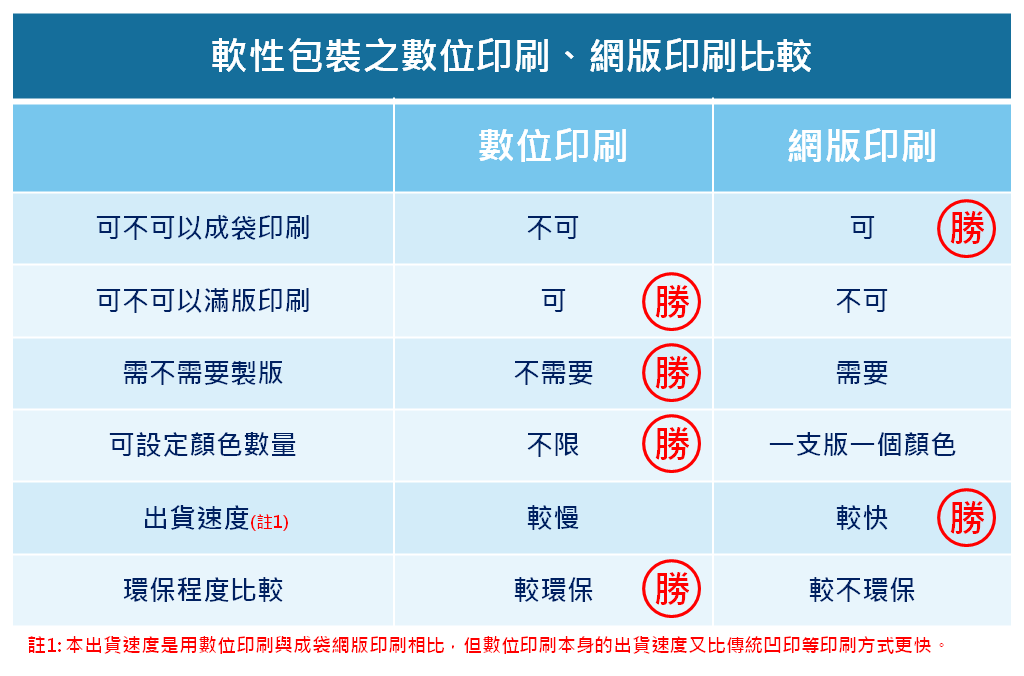 以上就是小編針對軟性包裝界 "網版印刷"、"數位印刷" 的差別,做一些簡單的原理說明跟比較,當然即便是相同的印刷方式也會因不同機台的關係而有些差異在,但原理則是大同小異喔!