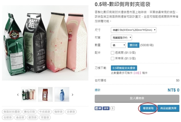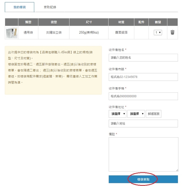 1. 您可以選擇需要的袋型按「樣袋索取」鍵