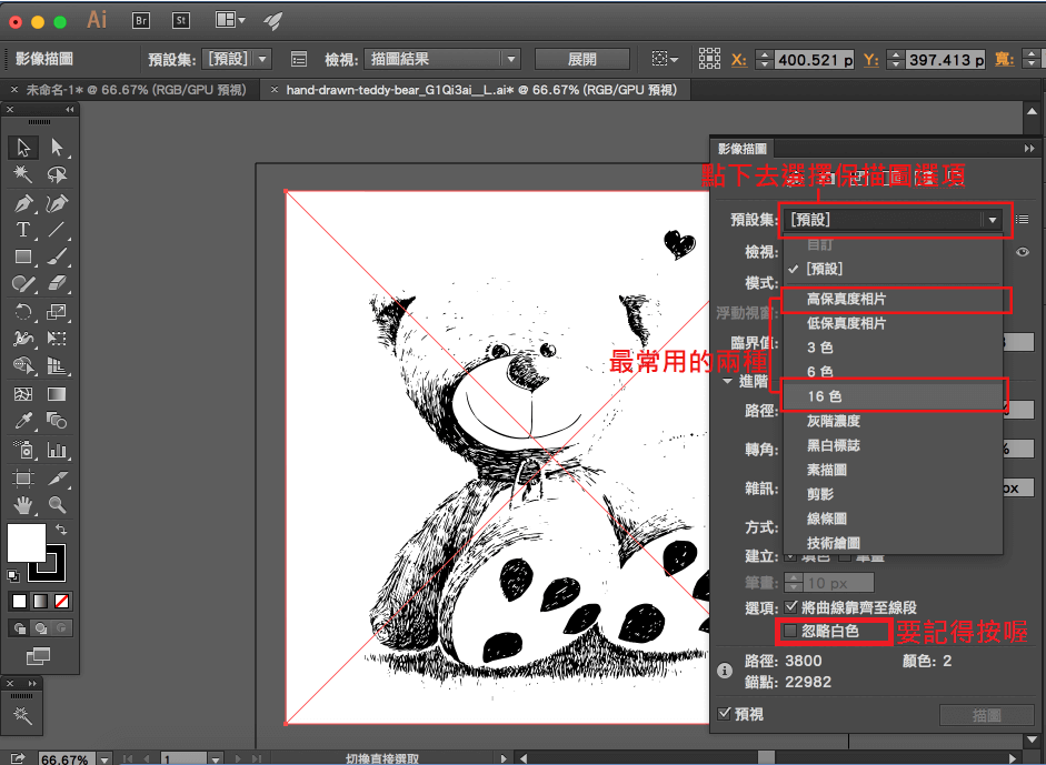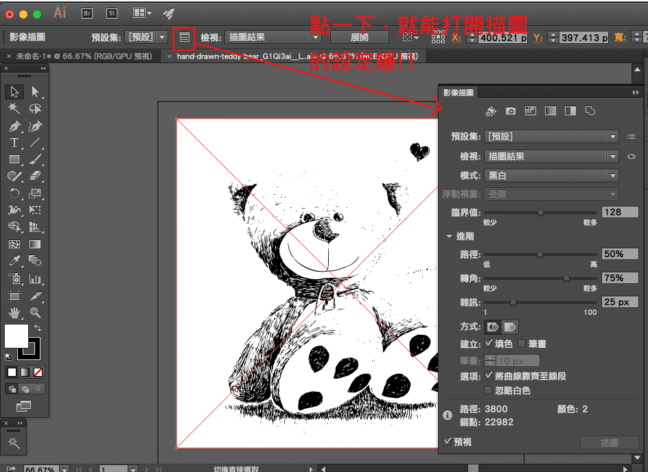 步驟三、點選我們的圖片按影像描圖,AI會將您的圖片自動繪製成向量圖檔,接著選擇去掉白色背景 ( 但也因為是自動繪製所以很容易失真,所以我們要去細項調整描圖的選項讓它比較符合我們原始的檔案喔,如果怎麼調都不是無法達到您的要求,就要換成PS比較好瞜!)