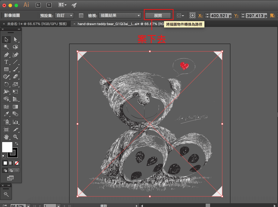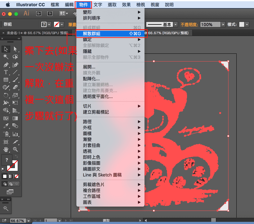 步驟四、描圖完後,接著我們就要『展開』它,然後到『物件>解散群組』,這樣我們就能修改圖片,將多餘的部分去掉啦!