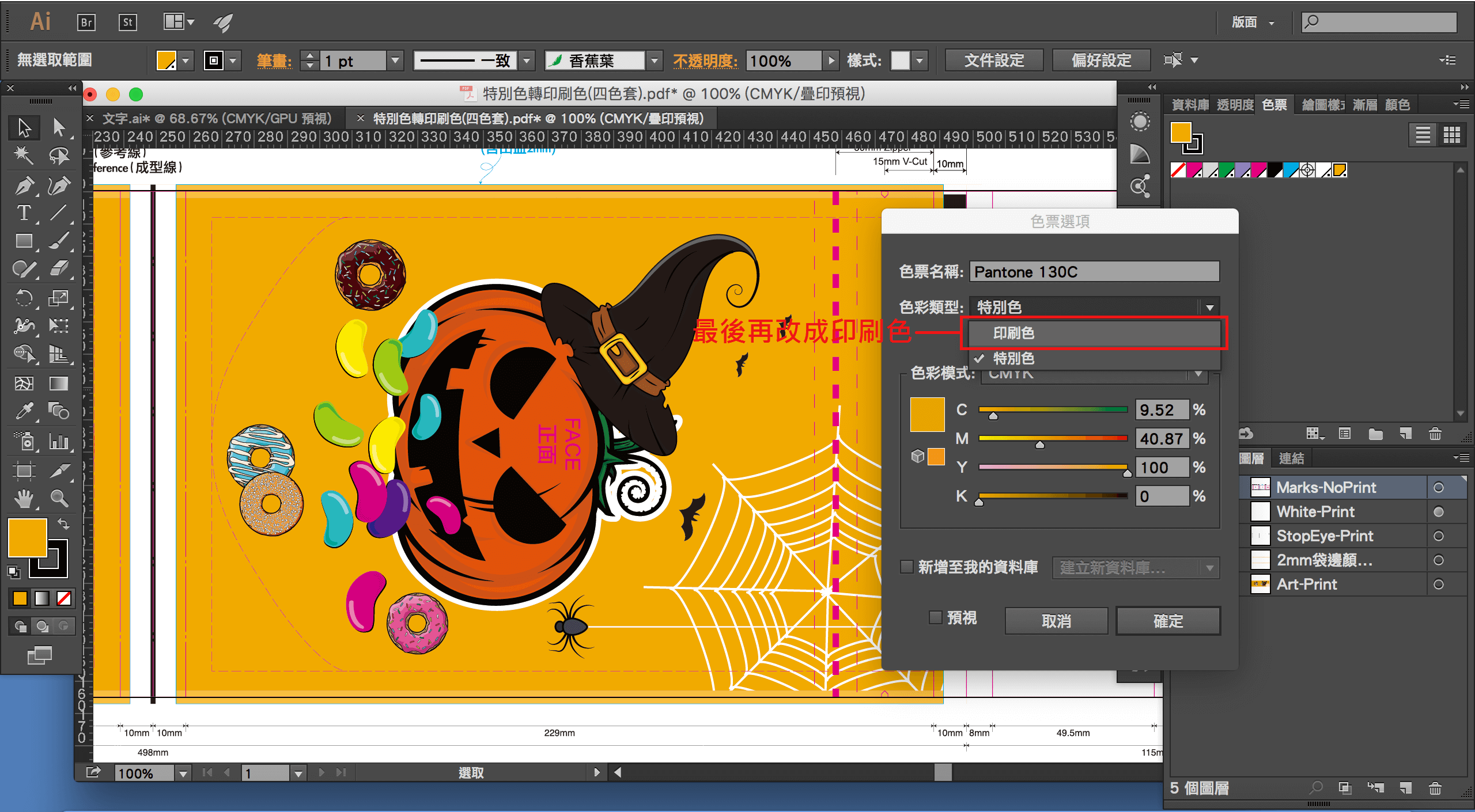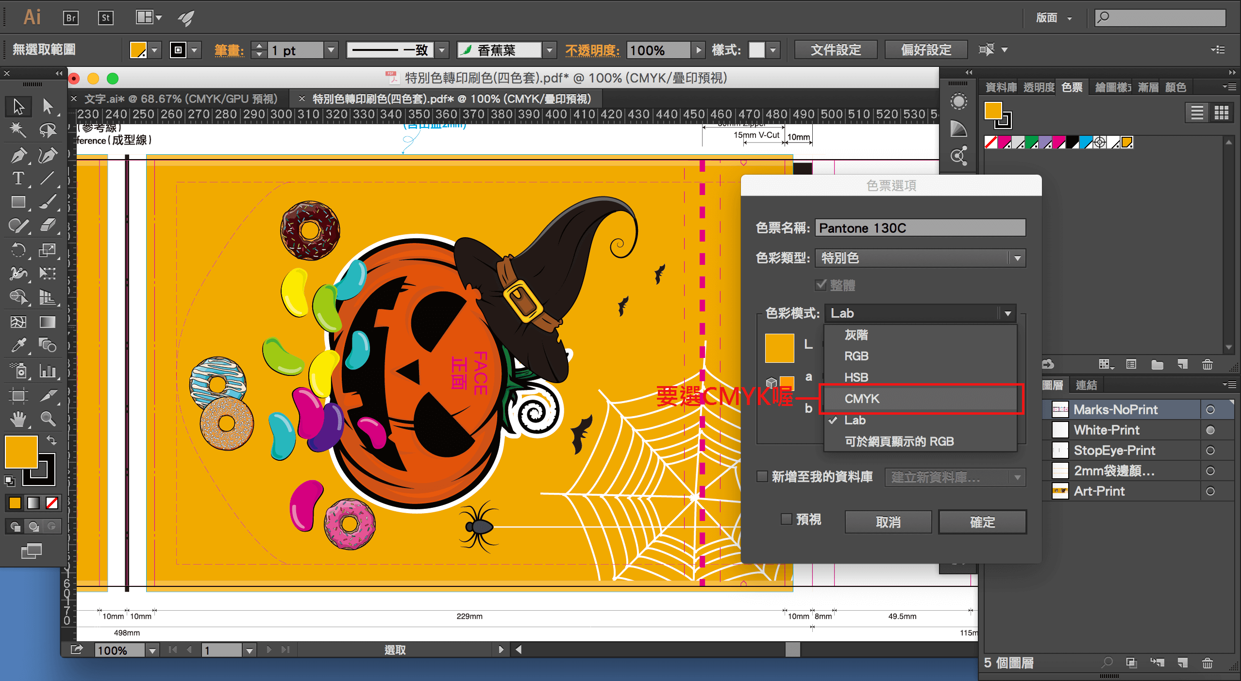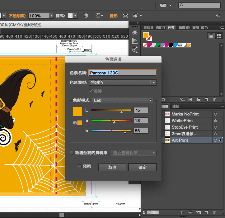 第三步、進入選項畫面,將色票的色彩模式調整成CMYK,色彩類型改成印刷色,然後按確定