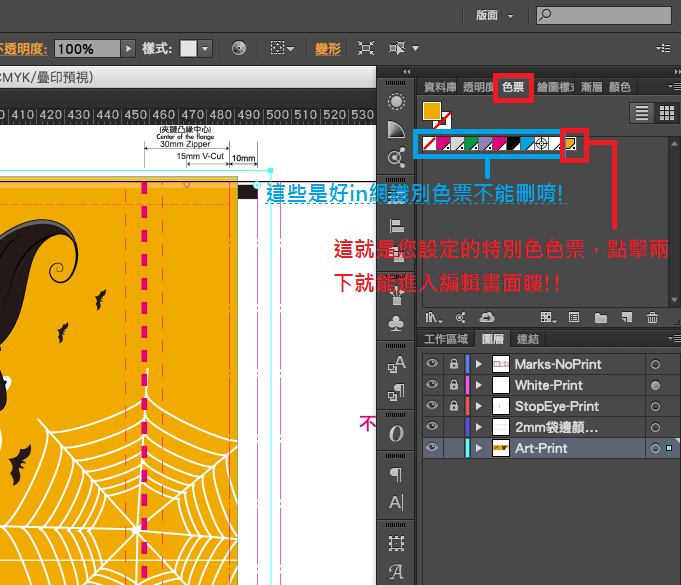 一來,可以看看您設定的特別色轉成印刷色時,是不是在CMYK的的套色範圍內,