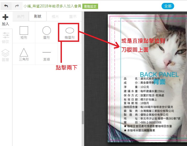 第七步、接著點選形狀→橢圓幫貓做個OS