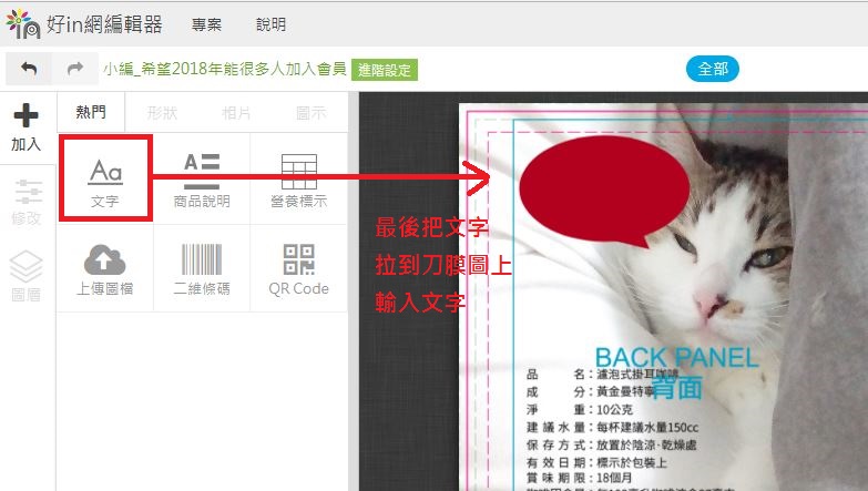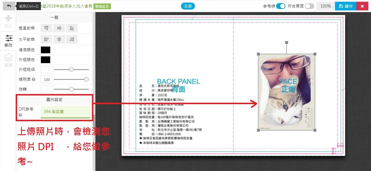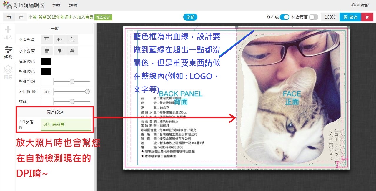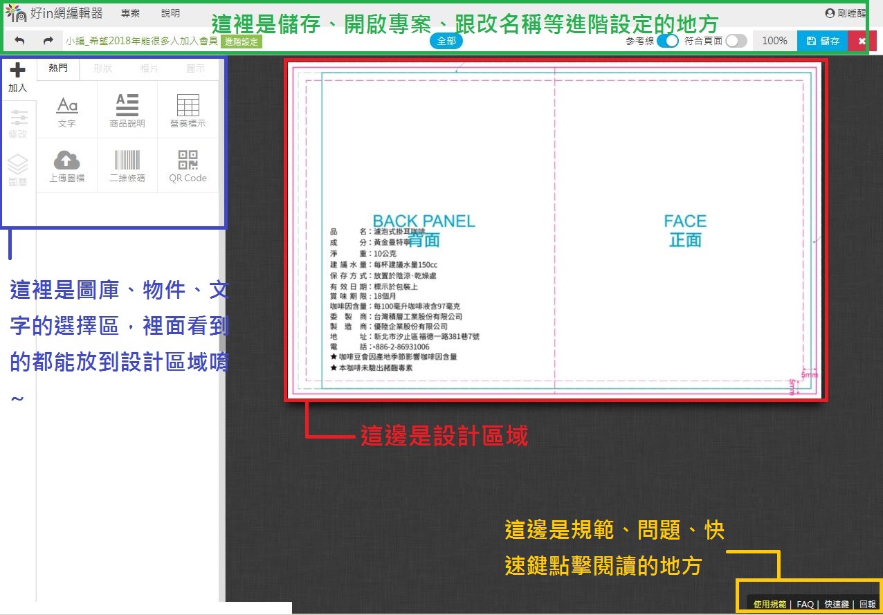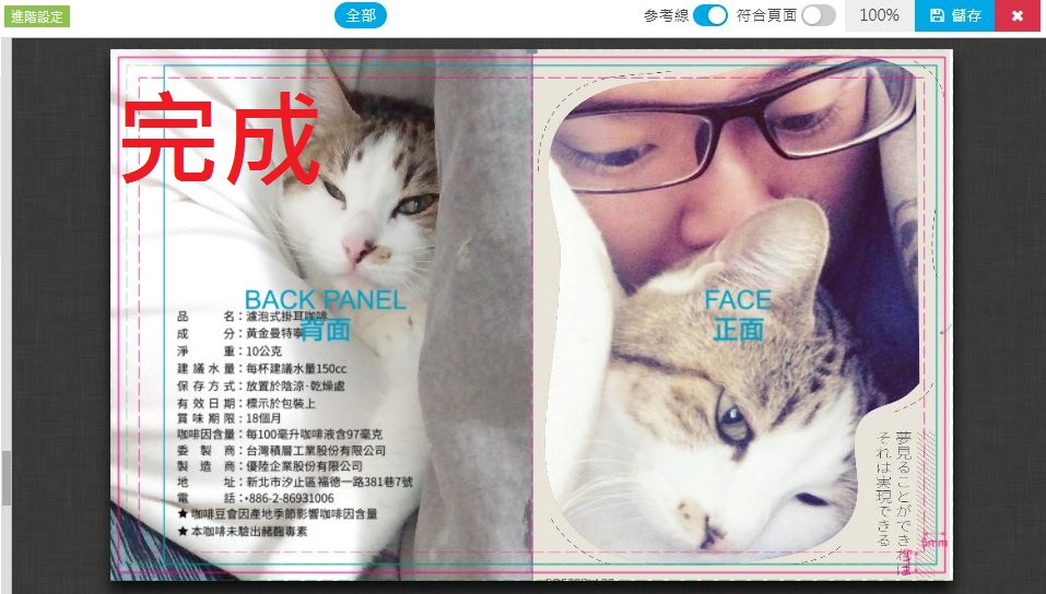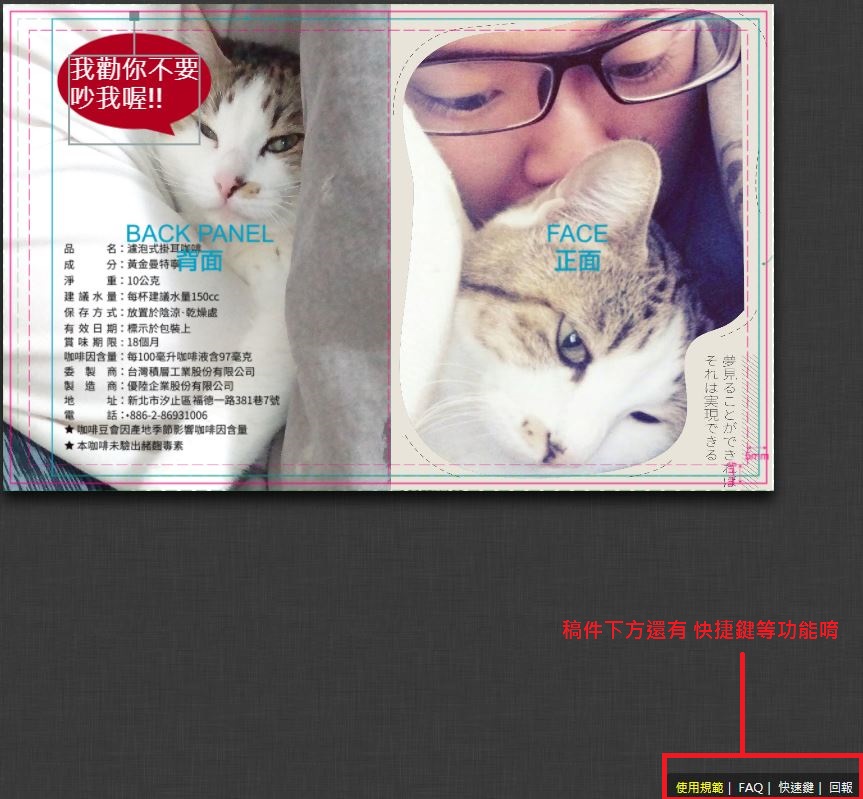 但是!!我們實驗了多種編輯器,也測試失敗了好幾次,總算完成了台灣包裝界第一家、大中華包裝界第一家 線上、免下載、操作簡單的【好in網】線上稿件編輯器,不只可以讓一般人跟剛入門的設計師們用最快的、最簡單的方法完成自己專屬的包裝袋設計或是個性化商品設計,又能符合稿件規範唷~