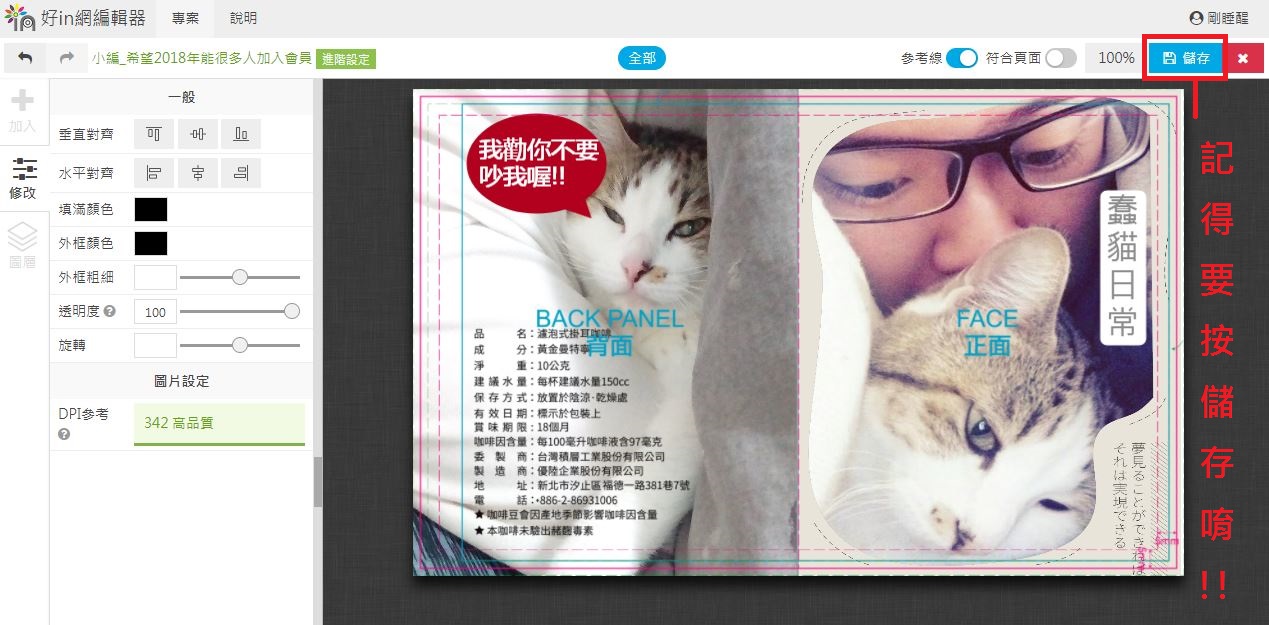 (p.s.完成稿件一定要記得按"儲存"不然下次打開專案裡面的設計都會消失唷~)