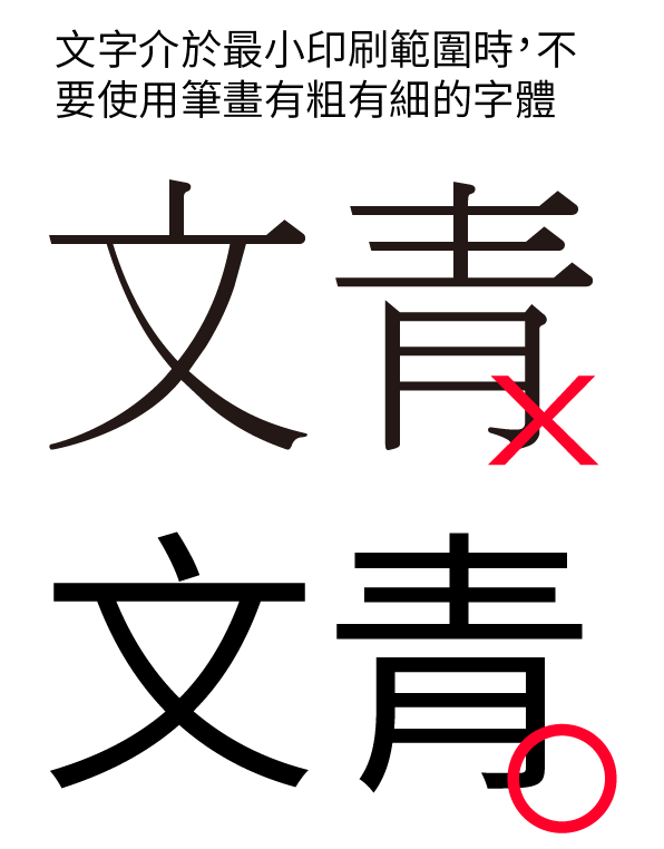 3.若您的文字大小會剛好在最小能印刷的範圍左右,那就建議您不要使用類似"宋體"這種字體本身有粗有細的字型,才不會導致文字細部模糊不清。
