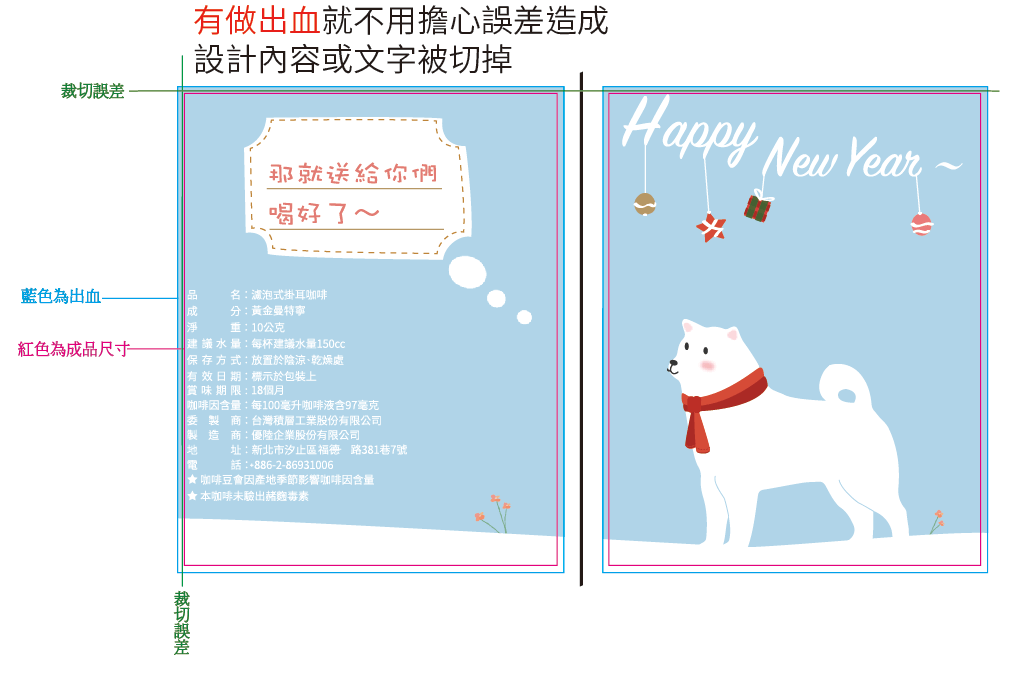 而在"裁切"跟"製袋"的過程中機台多多少少會有誤差(如下圖1),而出血就是在您的設計稿中在多做出2~5mm左右的安全範圍,讓切的過程中就算有誤差也只會切到這些多出來的地方,而不會切到您設計裡的東西(如下圖2)。
