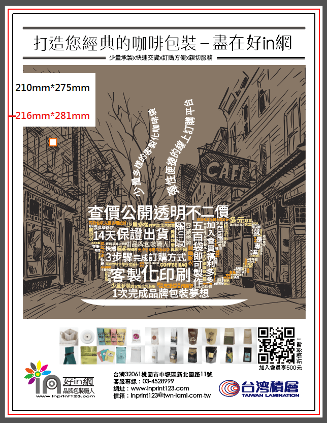 廣告稿請您提供全頁一頁,完成尺寸為210mm*275mm,製作尺寸為216mm*281mm的AI檔稿件。