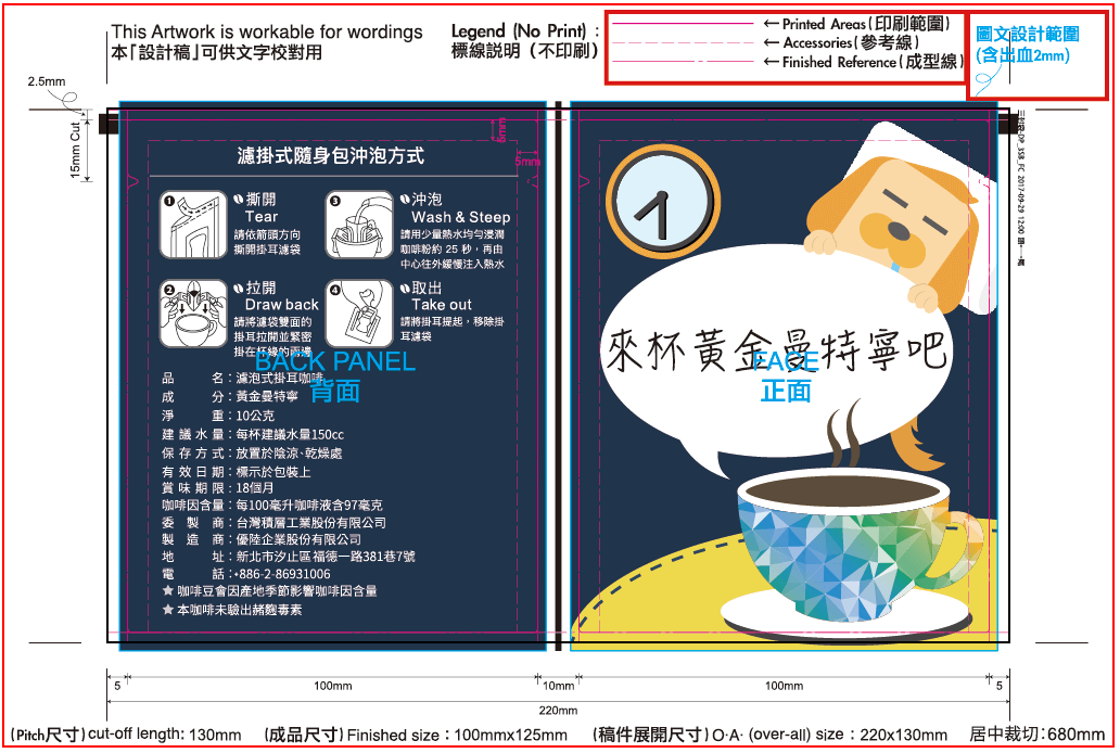 這類問題比較容易會出現在包裝設計上,有時候設計師接到像濾掛咖啡這種小型的三封袋、小型試用包這類尺寸較小的包裝袋會習慣性在AI中把它放大來進行設計,並為了排版好看而把字體設定到1pt以下,卻因此忘記這類輕包裝的原始尺寸其實不大,導致印刷或成品出現一些問題 :