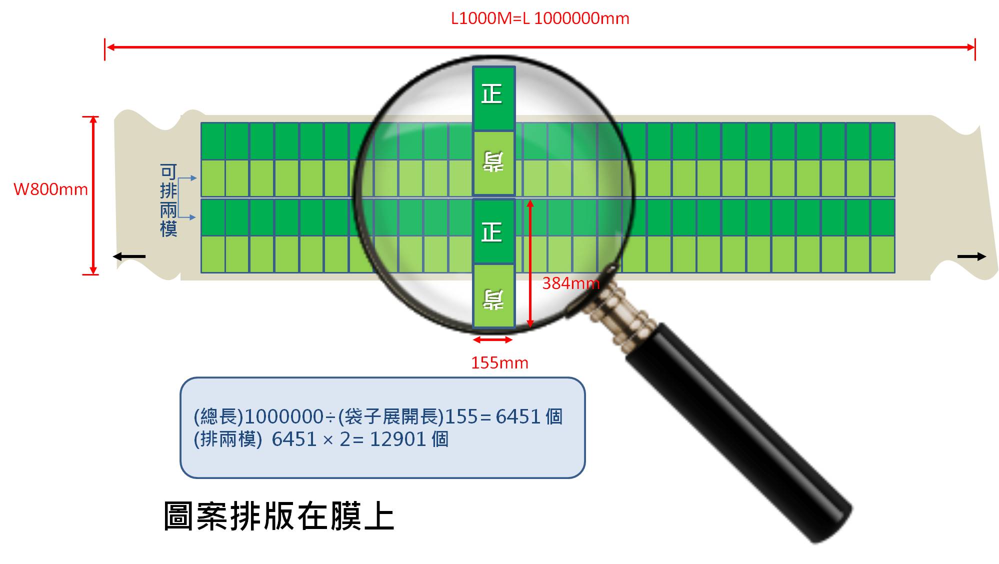 然而,就是這個然而,一個包裝袋的大小通常多大呢? 我們以市面上常見的站立袋中型尺寸為例:W155XL229XH(49.5x2)mm,這是一個立體包裝袋的概念,但包裝袋的製造過程還是得展開攤平來做,就跟您摺紙盒的意思是一樣的,原來的是一平面紙(膜)。所以當站立袋中型尺寸(W155XL229XH(49.5x2)mm)攤平後,其展開長與寬為W384XL155(mm),如果排版到原材料的模上,可以排出幾個呢?如果原材料模的面積為W800mm x L1000M去換算,可以排出約12900個袋子。