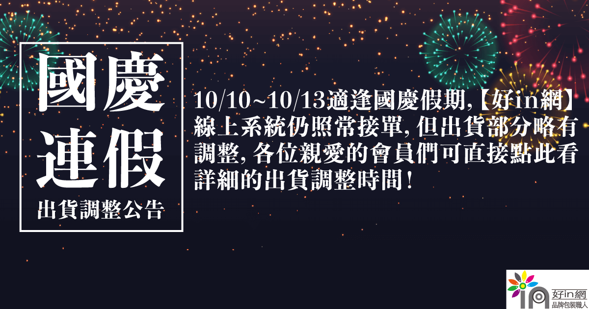 10/10~10/13適逢國慶假期,線上系統照常接單,但出貨略有調整。